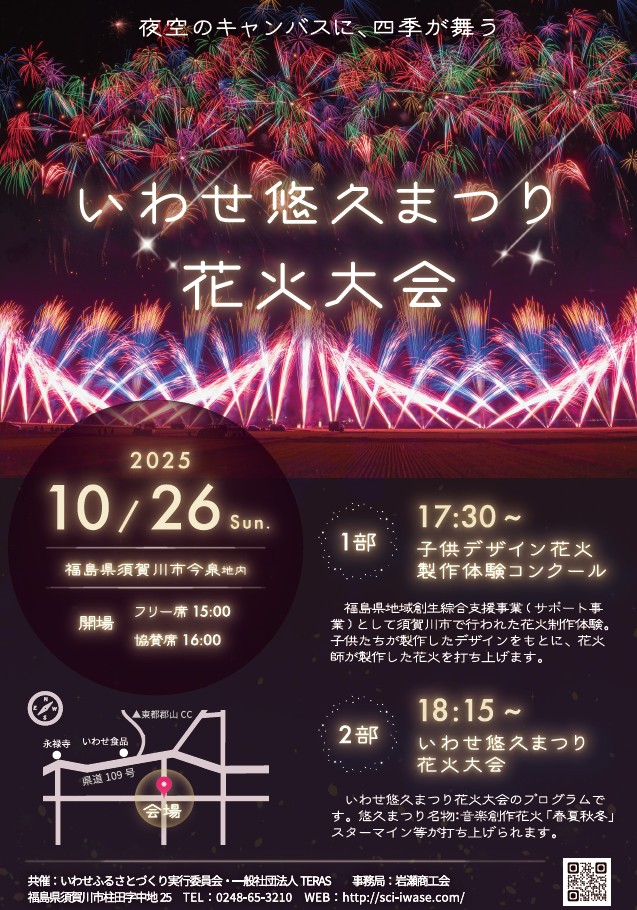 福島県須賀川市岩瀬地区にて毎年秋に開催される「いわせ悠久まつり花火大会」岩瀬地区の秋の夜空を尺玉の花火やスターマインで彩ります。